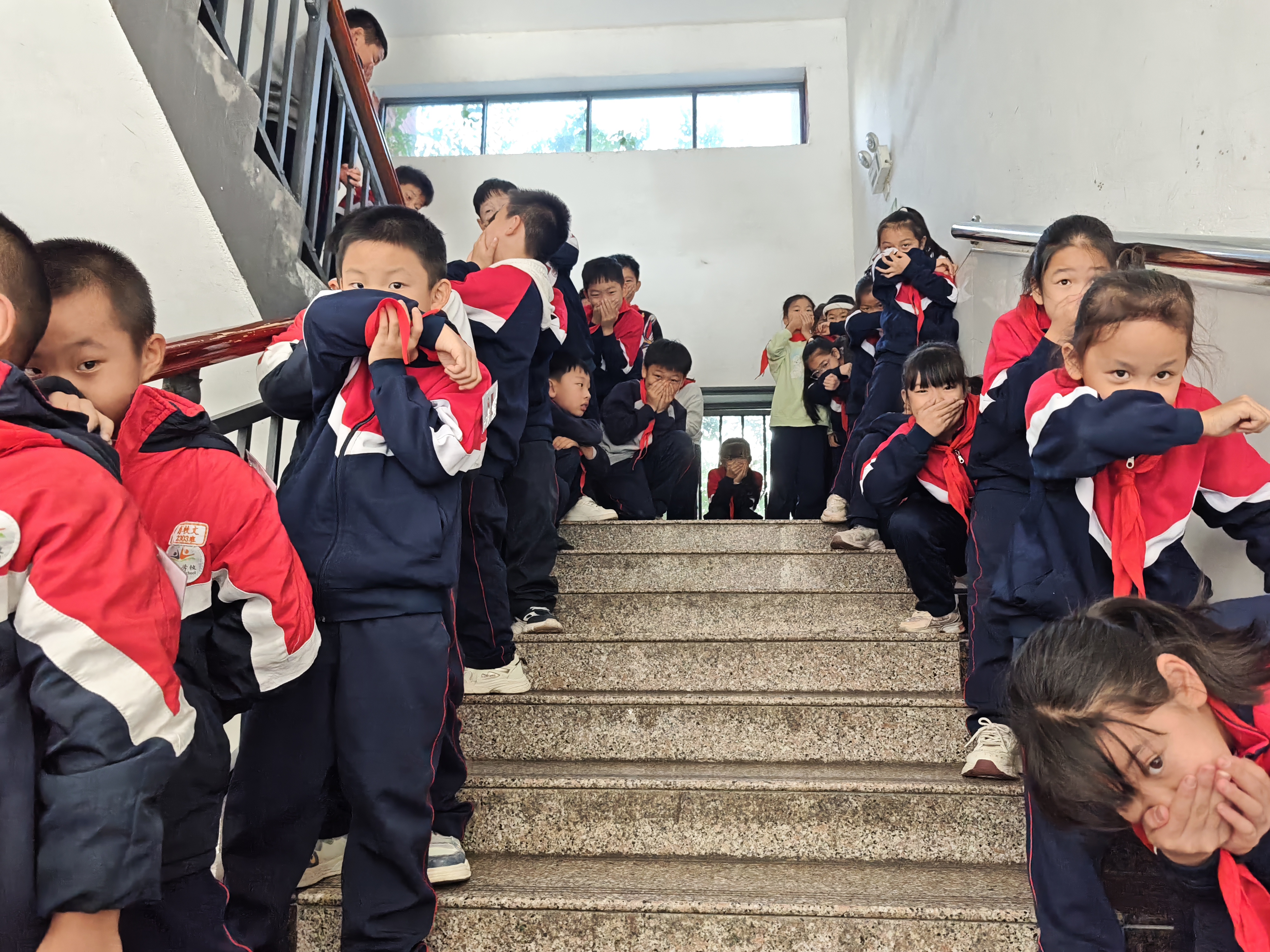 随着一阵急促的警报声响起,演练正式启动。各楼层负责教师迅速就位,各班班主任及副班主任立即引导学生沿预定路线有序撤离。学生们反应迅速,用湿毛巾捂住口鼻,弯腰低姿,沿指定通道快速、有序地向操场集结。整个疏散过程紧张而不慌乱,仅用数分钟,全体师生已安全到达指定区域。