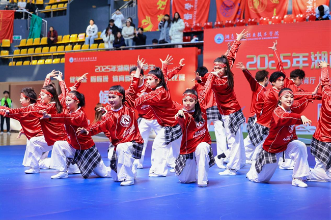 本次比赛由湖南省教育厅主办,比赛规模创下新高,共吸引来自全省62所高校的1081名运动员同场竞技。集体街舞啦啦操项目竞争尤为激烈,各队均以高难度动作、新颖编排和饱满表现力展开较量。在龙曾成领队和朱雅琪、傅丹、金丽菲教练团队的精心指导下,该校代表队以一套融合了街舞技巧与啦啦操精神的原创作品登场,队员们动作精准流畅,节奏张弛有度,将力与美完美结合,赢得了现场评委与观众的阵阵掌声。