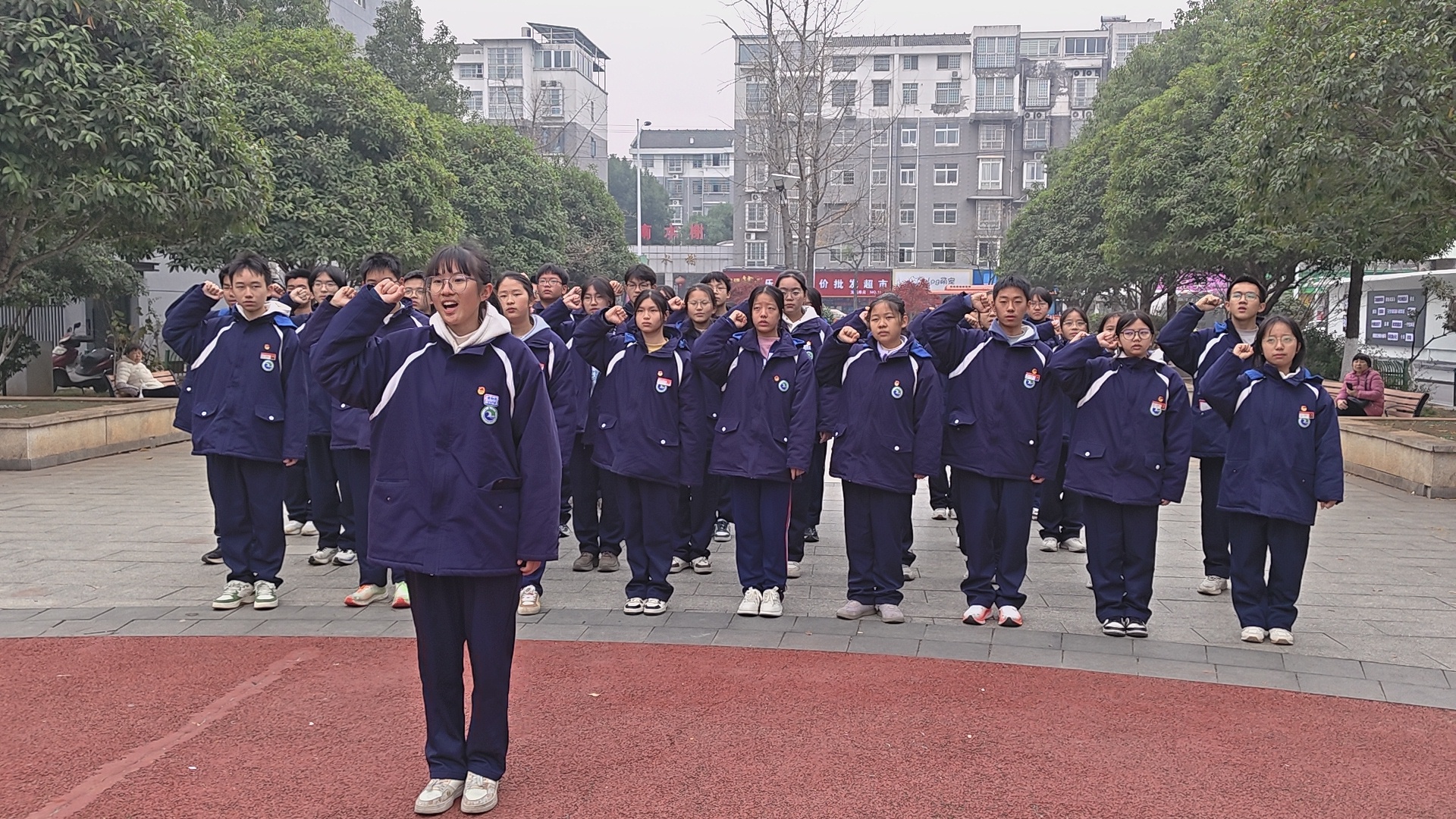 上午9时40分,团员们身着整套校服、佩戴团徽,在校门口整齐集合,怀着崇敬之心乘车前往陈辉公园。团员们走进陈辉烈士展陈馆,跟随讲解员的生动的讲解,通过历史图片、实物展品和文字介绍沉浸式了解陈辉烈士的生平事迹与革命历程,感受先烈们为家国理想挺身而出的无畏精神;在陈辉烈士塑像前,全体团员肃立列队,两名优秀团员代表李思毅、潘思霖深情讲述陈辉烈士的英雄事迹,带领大家齐诵陈辉同志创作的诗歌,表达对先烈的缅怀之情。随后,团员们举起右拳,重温入团誓词,铿锵誓言回荡在公园上空,彰显着新时代团员的责任与担当。