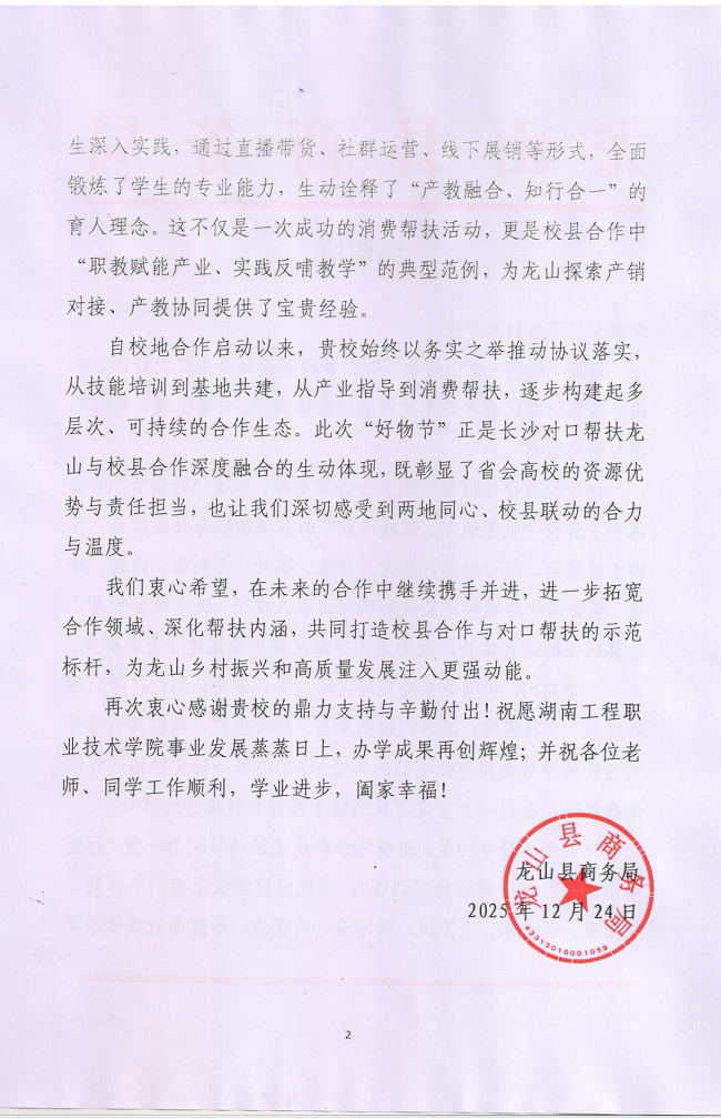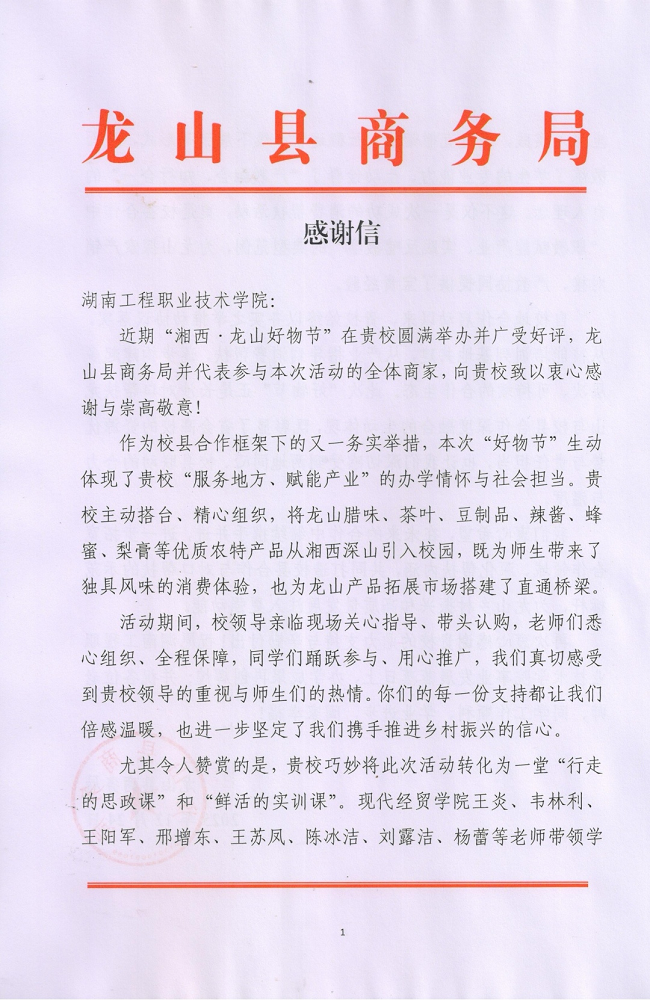 湖南教育新闻网讯(通讯员 韦林利)近日,湖南工程职业技术学院收到了一封来自龙山县商务局的感谢信。信中,龙山县商务局代表全县参与“湘西·龙山好物节”的商家,对学校在活动中的鼎力支持与师生们的辛勤付出表示衷心感谢,并高度评价此次活动是“校县合作中‘职教赋能产业、实践反哺教学’的典型范例”。