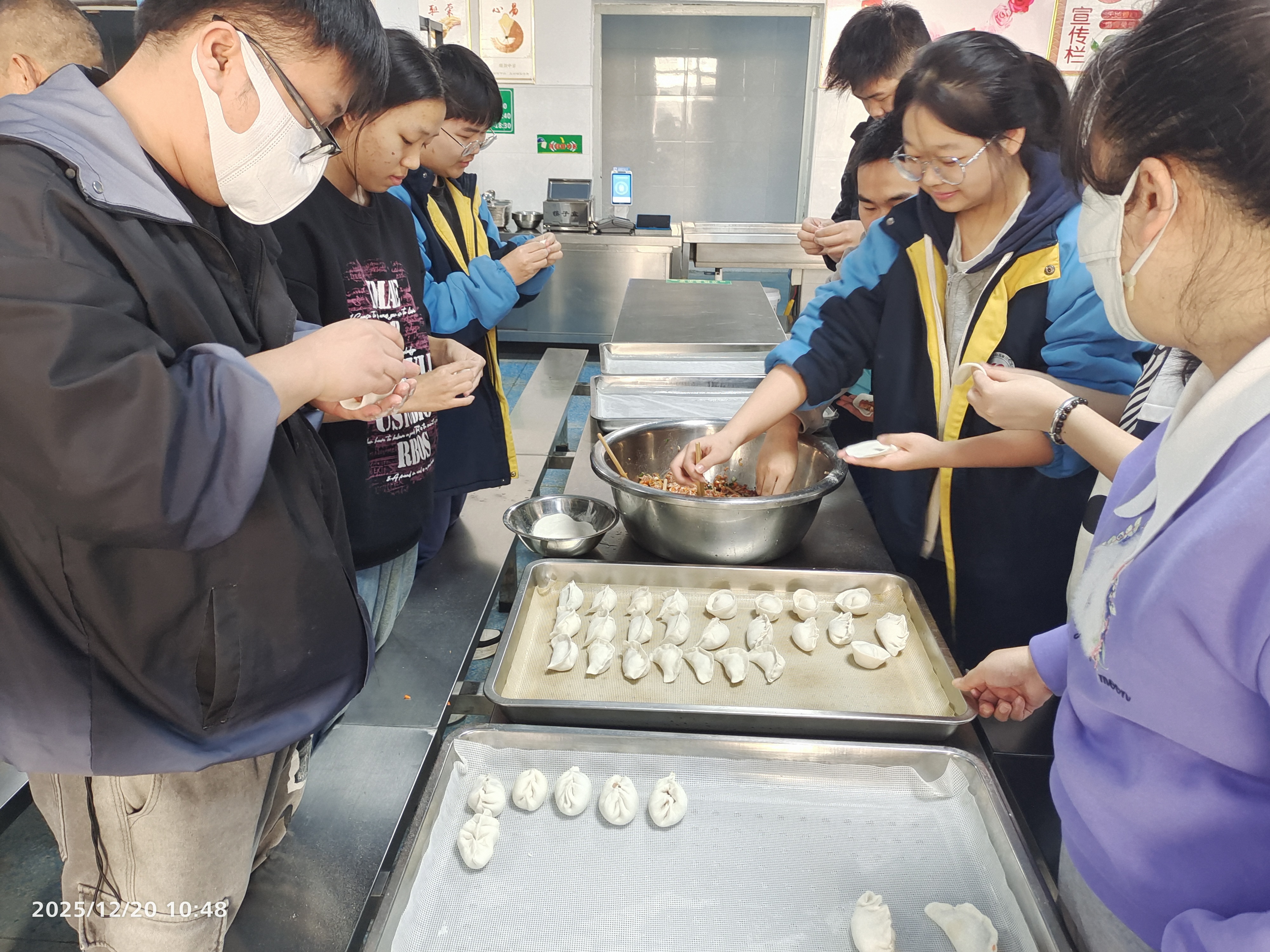 最热闹的环节当属包饺子。有的同学手法娴熟,捏出的饺子饱满精致,俨然“熟练工”;有的同学则略显生疏,在老师和同学的帮助下认真摸索,从生疏到逐渐成型,虽形态各异,却饱含热情与诚意。元宝形、月牙形、柳叶形……创意层出不穷,现场成了饺子造型的“博览会”。老师和同学们一边包着饺子,一边分享着关于冬至的习俗、家乡的过年故事以及学习生活中的点滴趣事,温情在指尖与笑语中流淌。