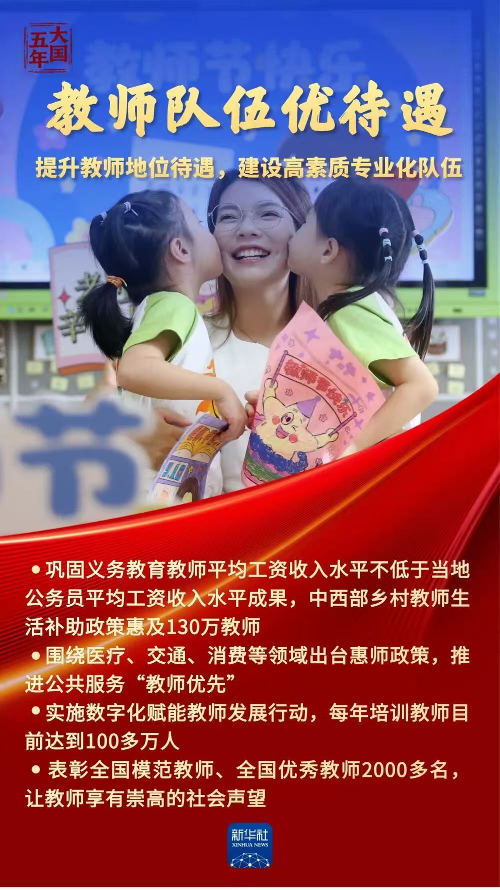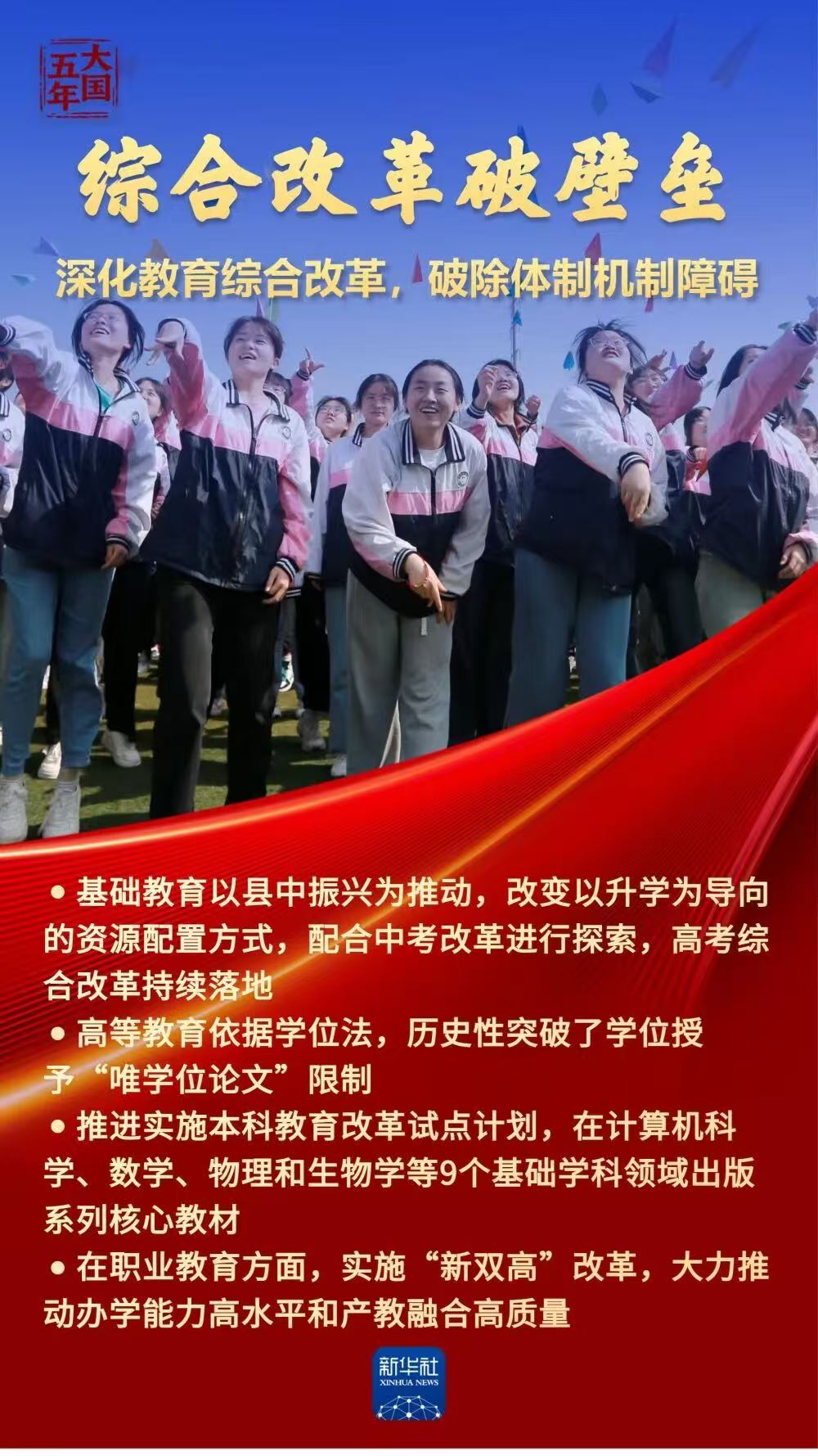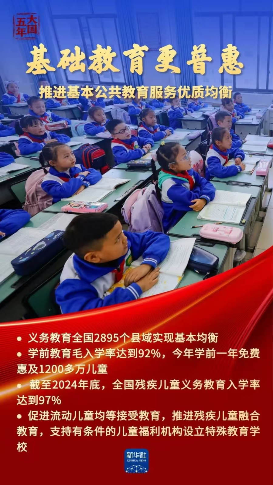 教育是国之大计、党之大计,事关国家发展、民族未来。“十四五”以来,我国建成世界规模最大且高质量的教育体系:孩子们“身上有汗、眼里有光”,理想信念的灯塔照亮青春征程;所有家庭经济困难学生资助全覆盖,每个孩子都拥有人生出彩的机会;高等教育步稳蹄急,赋能中国式现代化行稳致远……