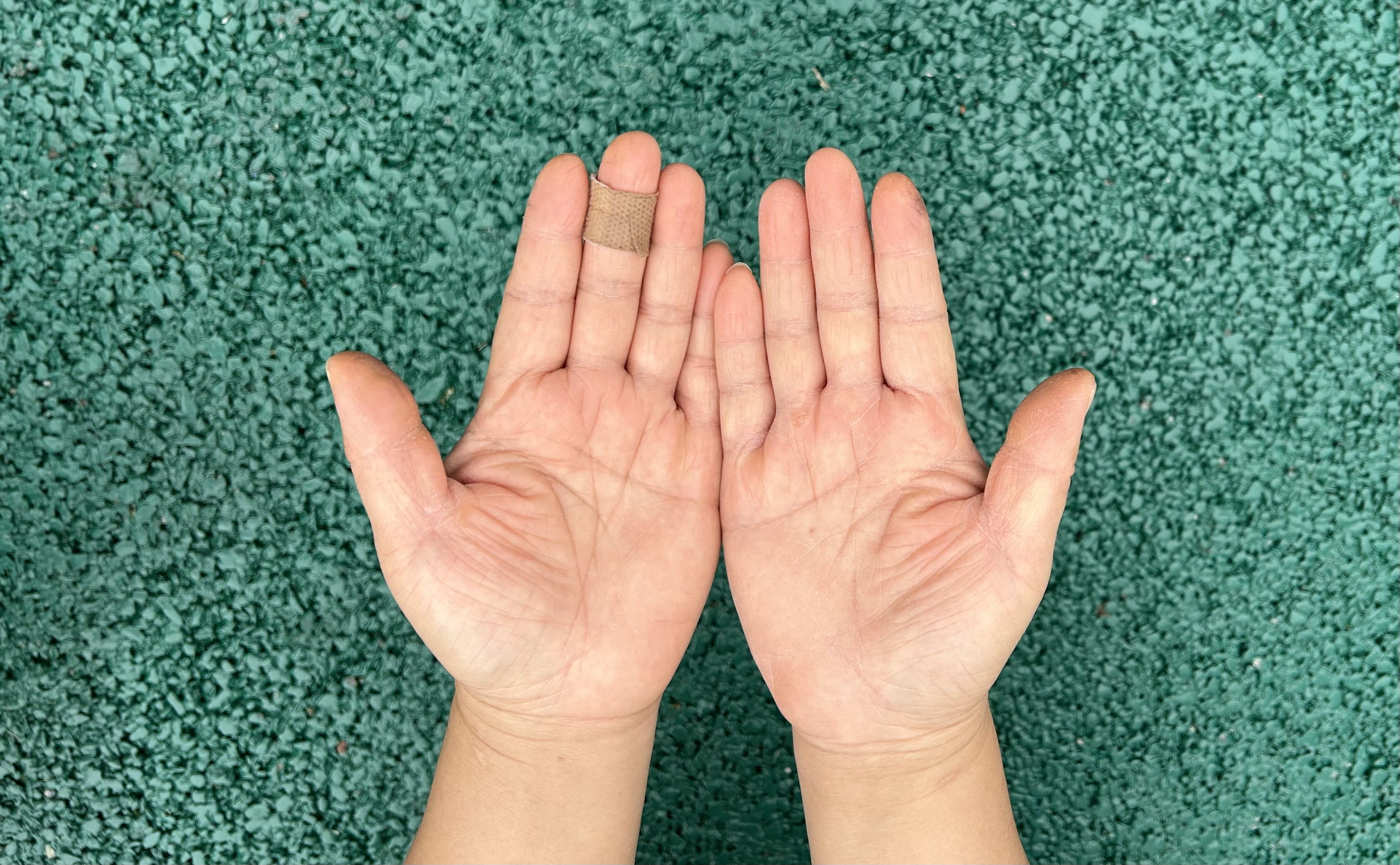 游乐场的绿色塑胶地上,摊着妈妈的手。